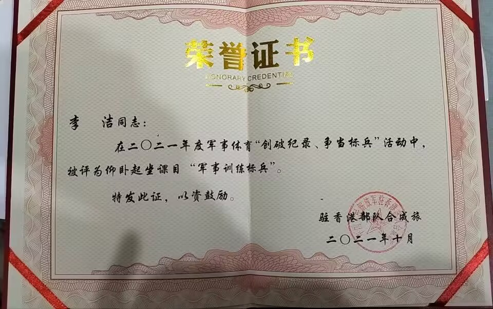在学校的宣传和影响下,李洁进一步坚定了自己的军旅梦,毅然决定报名参军。在2020年她进入中国人民解放军驻香港部队某特战连服役。作为一名特战队员,她始终奉行练就一身真本领才是硬道理,每天刻苦训练,掌握了射击、攀登、游泳、拳术、格斗等多种军事技能,并获得了优异的成绩,在部队组织的“创破纪录、争当标兵”活动中获得“军事训练标兵”称号,军事体育训练等级达到特3级,并获得嘉奖一次。期间,她还参加了香港陆海空三军多兵种出动实战演练、青山演习、香港维稳制乱红蓝对抗等大型军事活动,培养了她坚韧不拔、勇往直前的品质。